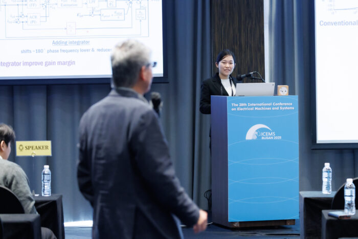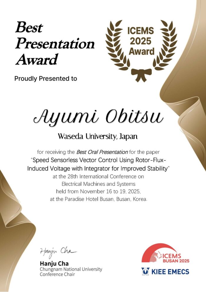 このたび、2025年11月16日~19日に開催されました「The 28th International Conference on Electrical Machines and Systems」において、「Speed Sensorless Vector Control Using Rotor-Flux-Induced Voltage with Integrator for Improved Stability」という題目で発表を行い、Best Oral Presentationを頂きましたことを報告させて頂きます。