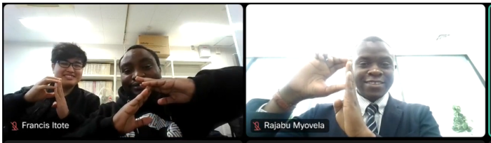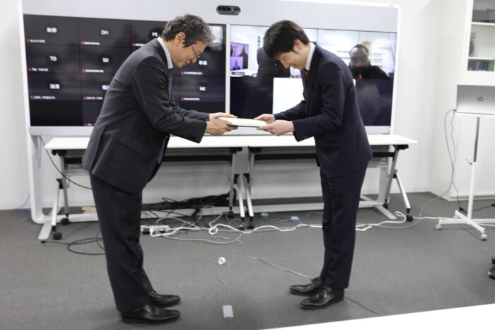 また今年度の新たな試みとして、13大学の総長・学長印のある修了証授与式「風」の写真撮影イベントも行いました(実際の修了証授与式は、各大学にて実施致します)。林プログラムコーディネーターが修了証を読み上げ、東北大学の加藤さんがPEPを代表して授与…される「風」の写真をぱしゃり。